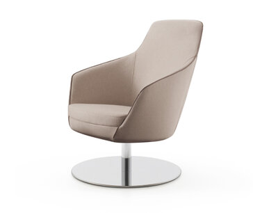 Poltrona moderna con basamento in metallo girevole, disponibile cromato o nero. Seduta e schienale in poliuretano espanso schiumato a freddo; disponibile in diversi rivestimenti: stoffa, ecopelle o pelle. Seduta dal design moderno che si adatta a diversi usi come casa, contract, navale. Particolarmente adatta per ristorante, bar, lounge,b&b, hotel, reception, caffè o sala d'attesa. Imbottitura certificata ignifuga 1IM , francese M4 e California 117:2013.