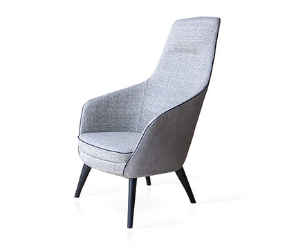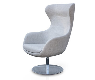 Poltrona dallo stile moderno con basamento girevole in metallo, disponibile cromato o nero. Struttura in poliuretano espanso schiumato a freddo; disponibile in diversi rivestimenti: stoffa, ecopelle o pelle. Modello che si adatta a diversi usi come casa, ufficio, navale, contract, lounge, caffè, b&b, reception, sala d'attesa, hotel. Imbottitura interna certificata ignifuga 1IM , francese M4 e California 117:2013.