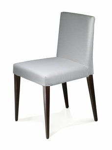 Sedia dallo stile moderno in massello di faggio o frassino. Verniciatura personalizzabile in tinte da campionario. Struttura in multistrato imbottita in poliuretano espaso elastico, disponibile in diversi rivestimento: stoffa, ecopelle, pelle. Seduta adatta sia all'uso casa che al contract per l'arredamento di ristorante, bar, hotel, b&b, caffè, reception, sala d'attesa.